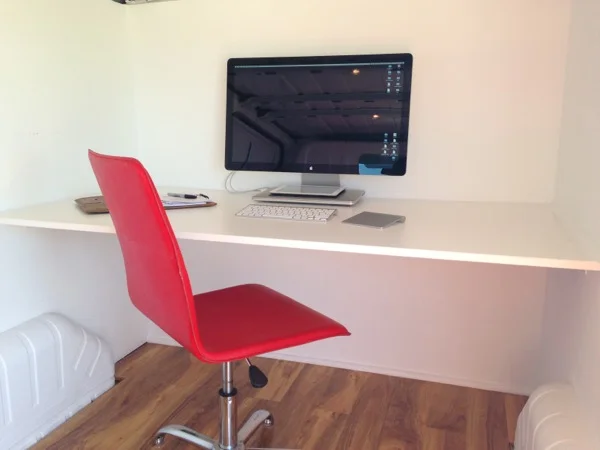 I like being super focused when I’m working at the monitor workstation, which is why I didn’t install a window there. If I need a view I sit on the couch with my laptop with both side doors open and work like that.